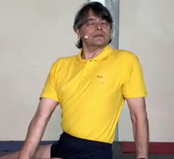 En Bharadvajasana, Birjoo prononce et répète le mantra Anantasana. Observez comment, tout en enseignant, il est lui-même absorbé. Observez aussi la zone du nombril pacifiée. A préciser qu’entre Jalandhara bandha et Mulabandha, Uddiyana Bandha se manifeste.
